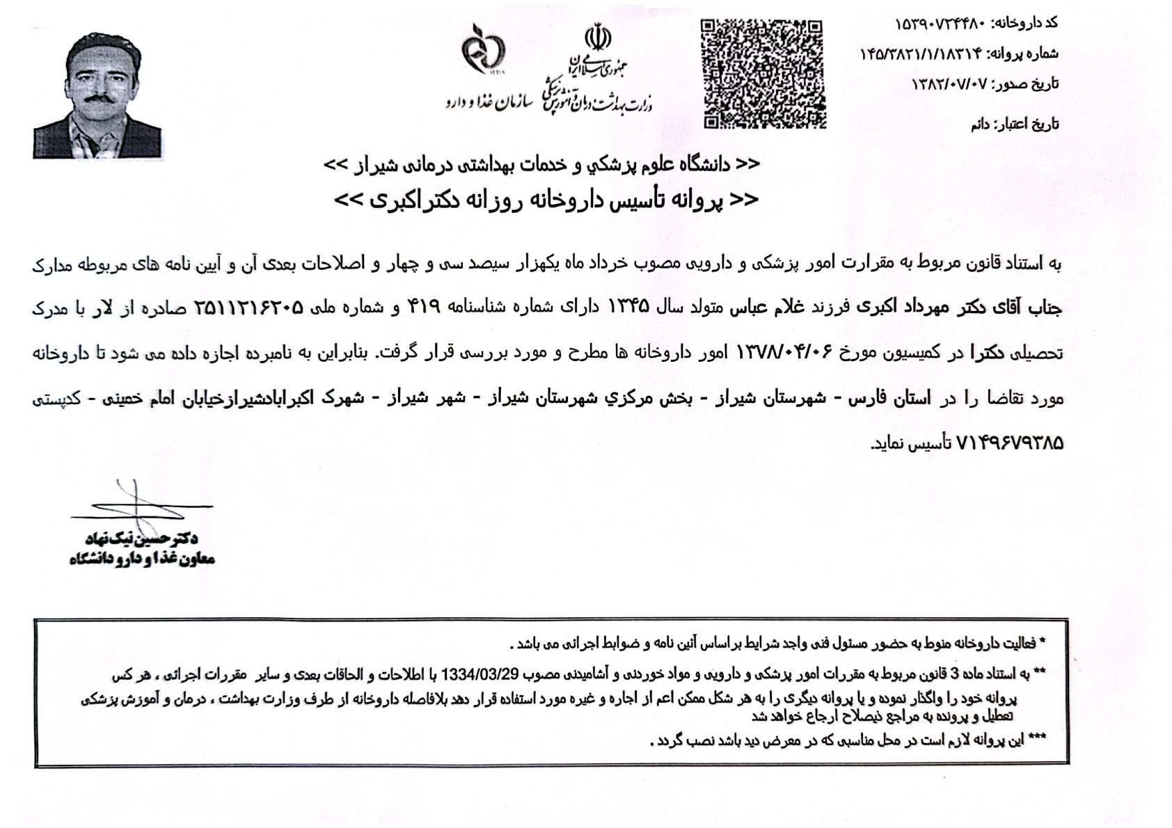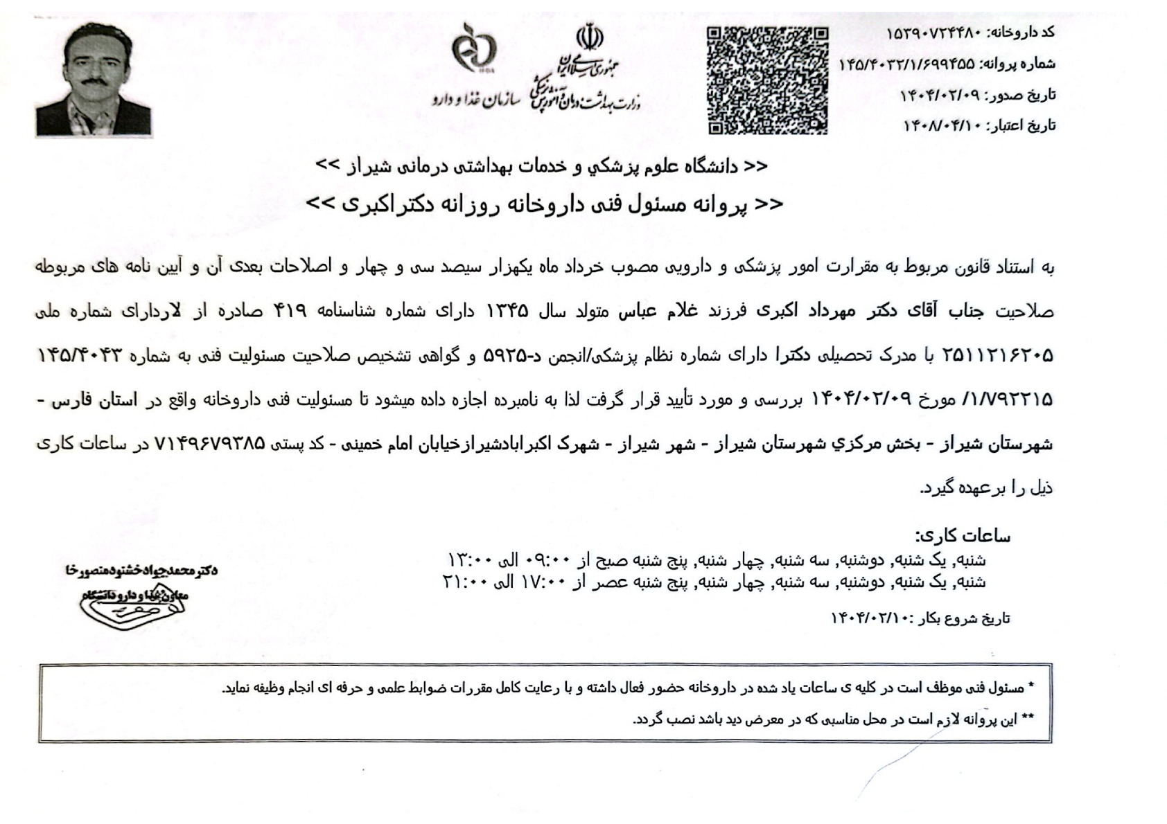 مکمل ورزشیدکتر مهرداد اکبری دکترای حرفهای داروسازی در شهر شیراز با شماره نظام پزشکی 5925 می باشد میتواند شما را در درمان بیماریها و مشکلات مربوط به دارویی یاری نماید.