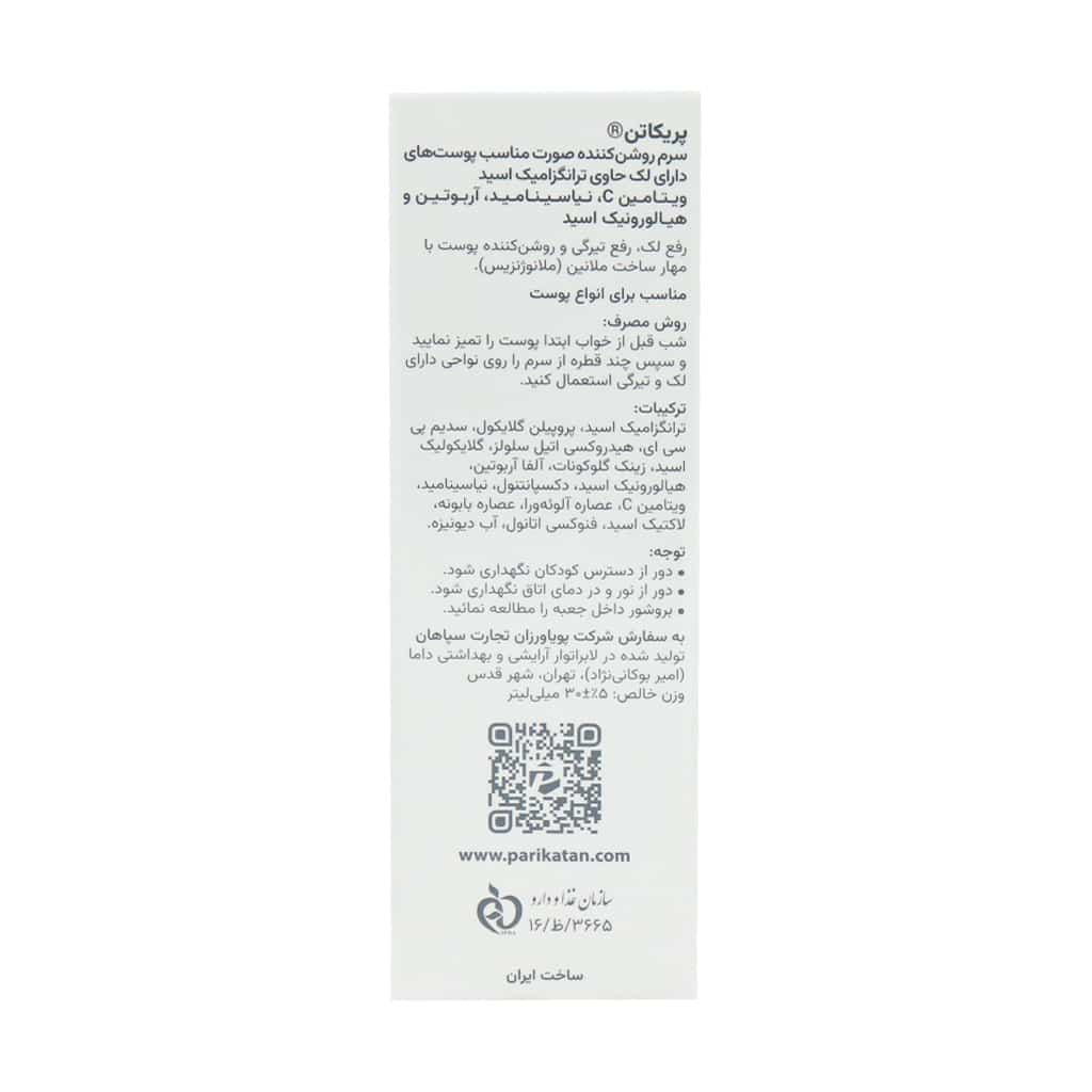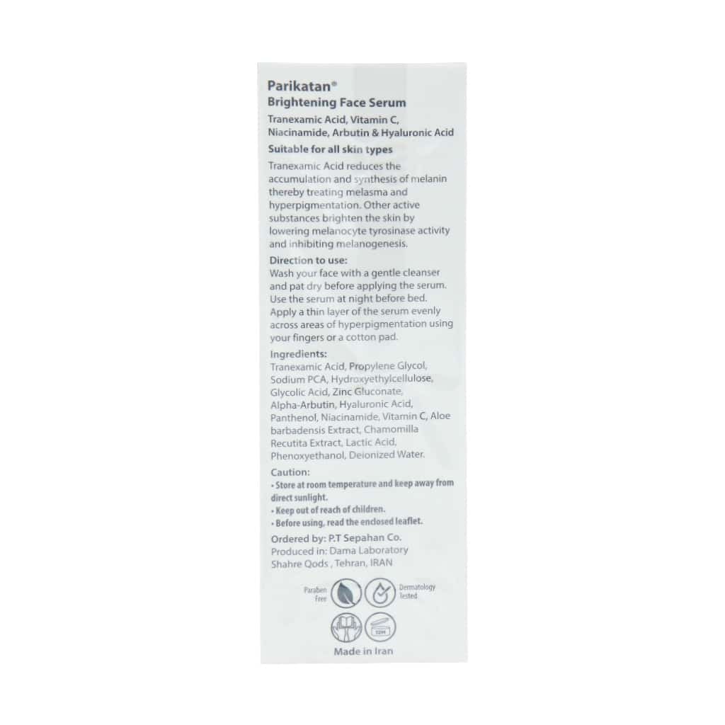سرم روشن کننده صورت پریکاتن حاوی ترکیبات موثر مانند ترانگزامیک اسید، ویتامین سی، نیاسینامید، آربوتین و هیالورونیک اسید بوده که به درمان انواع لک و تیرگی پوست، تیرگی کشاله رانها، زیر بغل، سینه، آرنج، زانو و خط بیکینی میپردازد و ظاهری شفاف و زیبا برای شما به ارمغان میآورد. این سرم میتواند به طور موثری به درمان لکهای ناشی از آفتاب، ملاسما و جای زخم کمک کند تا پوستی صاف، شاداب و بدون لک داشته باشید. سرم ضد لک پریکاتن با فرمولاسیون خود برای انواع پوست صورت و بدن مناسب بوده و فاقد مواد مضر مانند پارابن، سیلیکون و مشتقات سولفات است. توصیه میشود در طول درمان از کرم ضد آفتاب مناسب و سازگار با پوستتان استفاده نمایید.